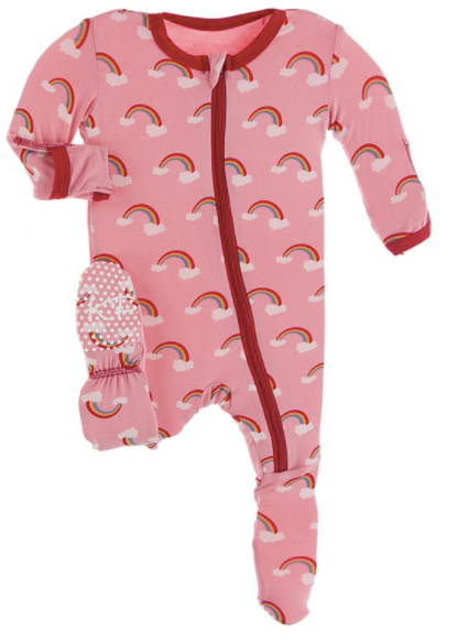 Our sweet footie features flip paws to cover cold hands and prevent scratching. The inside of the foot is lined with super soft fleece and the bottom features grips to prevent slipping!